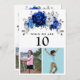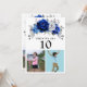 Elegante tarjeta de número de mesa con tema azul real, blanco y plateado que presenta un elegante ramo de flores de rosa de color azul real, azul marino, plateado, capullos de flores blancas puras y hojas de eucalipto verde salvia. Por favor, contácteme para cualquier ayuda en personalización o si necesita algún otro producto con este diseño.