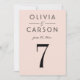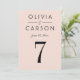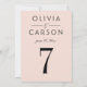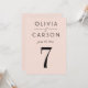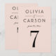 Un suave fondo rosa rubor y una tipografía serif negra y negrita crean una tarjeta de número de mesa de boda moderna y femenina. Los nombres de la pareja y la fecha de la boda se muestran en un diseño tipográfico limpio para un diseño de monograma elegante. Los nombres de la pareja, la fecha y el número de mesa son fáciles de personalizar. Cada número de mesa debe personalizarse individualmente y agregarse al carrito uno a la vez.
