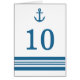 Elegante y clásico Tarjeta Nautical Anchor Table Number con un sencillo ancla de barco y una serie de rayas azul marino oscuro y blanco. Esta tarjeta de boda con temática náutica se puede personalizar fácilmente con los detalles de su boda. Para obtener más opciones de personalización, haga clic en el botón Personalizar.