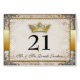 Tarjeta Ornate Fairytale Boda Número de Tabla. Con colores reales de regalías de oro y plata y perlescentes. Esta elegante y sofisticada tarjeta de mesa de cuento de hadas es ideal para cualquier saludo para mostrar su agradecimiento. Con un toque de elegancia y encanto, podrás mostrar tus mesas y hacer saber a los clientes dónde se sientan. Tiene perlas falsas y diamantes en las flores que hay en las esquinas. Una corona real se sienta en la parte inferior derecha adornada con oro y joyas. Un ilustracion de fibra se sienta sobre un fondo vintage y un borde ornamentado sostiene el papel ornamentado texturado en el medio.