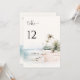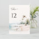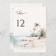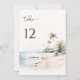 Escena de playa de Watercolor tropical, tarjeta número de mesa boda. Tipografía negra de color beige claro.