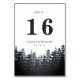Las tarjetas numéricas de la tabla de moda rústica de bosques presentan un borde de pino en tonos profundos de azul polvoriento y gris carbón vegetal, enmarcando el número de la tabla, la fecha del evento y el texto adicional del personalizado. El diseño se repite al revés. Coordina con nuestra suite de invitaciones a bodas de Winter Forest.