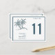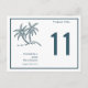 Esta tarjeta numérica está limpia y es sencilla, con dos palmeras azules y un borde exterior del mismo color azul. Los nombres de la novia y del novio, así como la fecha del boda, están debajo de las palmas. El número de tabla es claro y legible. El lado inverso es el diseño exacto para que pueda verse desde ambos lados. Es ideal para una decoración tropical, playera, costera, costera o boda oceánica.