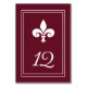 Elegante y sencilla tarjeta de mesa Boda con un cordón de lis sobre un fondo de vino. Este diseño es una elección única para un boda moderno. Fácil de personalizar con los números de tabla correspondientes. Haga clic en "Personalizar" para encontrar más opciones de personalización.