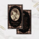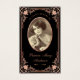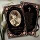 Tarjeta de oración conmemorativa con aire vintage para un funeral. En ambos lados, es negra y tiene un elegante marco de color rosa barroco (faux). En la parte delantera, hay una foto oval vintage con un borde dorado subió y texto rosa encima y debajo. Las palabras "en la memoria amorosa" se colocan encima de la foto. El nombre se escribe bajo él en un guión caligráfico elegante. En la parte de atrás hay una oración, con gorras rosas, con una cruz de oro rosa encima de ella. El fondo con sus elegantes decoraciones de oro barroco sobre fijación de cuero azul es de un encuadernador de libros francés vintage, de Georges Mercier (1885-1939) - Madame de Maupin de Teophile Gautier, volumen 1, edición 1911, París - ahora de dominio público, de la Biblioteca Pública de Nueva York. Zoltan Matuska de Pixabay ofreció la foto de un marcador de posición, un viejo retrato sepia de una joven de principios del siglo XX, gratis para uso comercial.