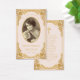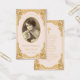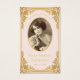 Tarjeta de oración conmemorativa con aire vintage para un funeral. En ambos lados, el color rosa es el rubor y el elegante marco dorado barroco de imitación. En la parte delantera, hay una foto oval vintage con un borde de oro falso y texto encima y debajo. Las palabras "en la memoria amorosa" se colocan encima de la foto. En la parte de atrás hay una oración, en mayúsculas, con una falsa cruz de oro sobre ella. El texto es dorado. El fondo con sus elegantes decoraciones de oro barroco sobre fijación de cuero azul es de un encuadernador de libros francés vintage, de Georges Mercier (1885-1939) - Madame de Maupin por Theophile Gautier, volumen 1, edición 1911, París - ahora de dominio público, de la Biblioteca Pública de Nueva York. Zoltan Matuska de Pixabay ofreció la foto de un marcador de posición, un viejo retrato sepia de una joven de principios del siglo XX, gratis para uso comercial.