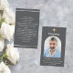 Fondo gris oscuro, cruz de oro falso y marco en forma de arco para una foto. Personaliza y agrega nombre, fechas y tu texto y oración. Texto blanco.
