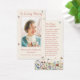 Esta es una moderna y caprichosa tarjeta de plegaria conmemorativa. El diseño cuenta con un hermoso tipo de letra caligráfica y hermosas flores silvestres en tonos rosa pastel, púrpura, azul, amarillos y rojos o terracota, además de delicadas mariposas que revolotean. Esta tarjeta de oración funeraria se puede personalizar fácilmente con tu propia foto para crear un tributo especial para tu ser querido usando la plantilla proporcionada. Póngase en contacto con el diseñador para cualquier consulta relacionada con este diseño o para cualquier producto que coincida.