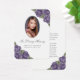 Hermosa tarjeta de memoria floral púrpura y plateada/tarjeta de oración fúnebre con una foto adornada con rosas púrpuras y flores del aliento del bebé en un fondo blanco y claro.