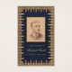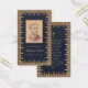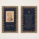 Una tarjeta de oración conmemorativa con un aire vintage. Tiene un marco dorado antiguo con aspecto de encaje y fondo azul marino con aspecto de cuero. Hay una foto de relleno antigua en la parte frontal y una oración en la parte posterior. El texto es dorado, el fondo es azul marino, el nombre está escrito en una elegante letra caligráfica. En la parte posterior, hay una cruz dorada sobre la oración.