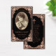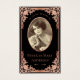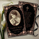 Una tarjeta de oración conmemorativa con un aire vintage para un funeral. En ambos lados, es negra y tiene un elegante marco barroco vintage de oro rosa (falso). En el frente, hay una foto ovalada vintage con borde de oro rosa y texto rosa encima y debajo. Las palabras "en memoria amorosa" están arqueadas sobre la foto. En el reverso hay una oración, en mayúsculas rosas, con una cruz de oro rosa encima.