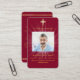 Un fondo burdeos, un espacio para tu foto. Una cruz dorada. Vigas de luz, detrás de la foto. Personaliza y agrega nombre, fechas y tu texto y oración.