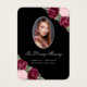 Elegante tarjeta de memoria floral en negro y plateado/tarjeta de oración funeraria con una foto adornada con rosas de acuarela rosa y rojo borgoña y flores de aliento del bebé sobre un fondo negro.