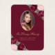 Hermosa tarjeta de memoria floral roja y rosa/tarjeta de oración fúnebre con una foto adornada con rosas rojas color agua rosa rubor y burdeos y aliento del bebé sobre un fondo rojo oscuro.