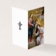 El diseño de la tarjeta de ordenación de sacerdotes muestra la imagen de Cristo y un ángel instituyendo órdenes sagradas. Una hermosa manera de simbolizar la ordenación de un sacerdote católico. Adentro da la apariencia de vestidos sacerdotes como fondo de tu texto. Un crucifijo se retrata en el reverso de la tarjeta.