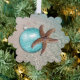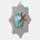 Mares y saludos de los Navidades de las estrellas de mar para colgar el árbol. Doble cara con adorno azul acuático y diseño de estrellas de mar sobre un fondo de playa tropical por un lado. Añade texto blanco al revés, con un saludo y firma, sobre la imagen de fondo de las olas del océano.
