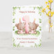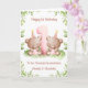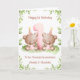 Esta tarjeta de cumpleaños es adecuada para gemelas. El diseño incluye un borde de vegetación en acuarela, el número 1 en rosa, y dos ositos de peluche marrones con globos de cumpleaños y sombreros de fiesta.