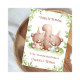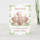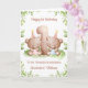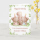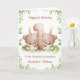 Esta tarjeta de cumpleaños número 1 es adecuada para gemelos niña y niño. El diseño incluye un borde de vegetación en acuarela, el número 1 y dos ositos de peluche marrones con globos de cumpleaños y sombreros de fiesta.
