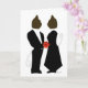 Pareja de gatos con traje de gala. El gato galante ofrece a su dama un hermoso ramo rojo. La tarjeta perfecta para los amantes de los gatos que se casan o celebran un aniversario.