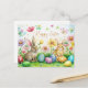 Tarjeta de Pascua con bonitos conejitos, flores y
