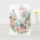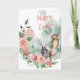 En la parte delantera de esta bonita tarjeta de la temporada de Pascua hay dos adorables conejos, uno marrón y otro gris. Los conejos están rodeados por una media corona de flores primaverales de color rosa pálido, con un fondo de salpicadura de acuarela verde pálido. El texto de color coral rosa coincidente dice "Feliz Pascua". El interior de la tarjeta tiene dos campos de texto personalizados y un ramo floral coincidente con una paloma blanca descendiendo sobre él. Muy delicado y muy apropiado para la temporada de Pascua. Todo el texto se cambia fácilmente a lo que desees.