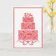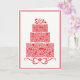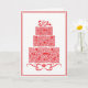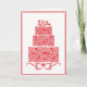 Se muestra la tarjeta de felicitación de boda con una impresión gráfica de un pastel rojo elegante.