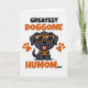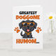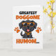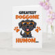 Esta tarjeta de felicitación presenta un perro estilizado de pelaje oscuro centrado en un fondo blanco brillante, sentado erguido con una mirada alegre y amigable que se siente como un saludo afectuoso ❤️. El perro está dibujado en tonos de carbón profundo con reflejos brillantes, y su lengua asoma como si estuviera sonriendo a alguien a quien adora. Unas gafas de sol de color naranja calabaza se sientan en su rostro, añadiendo un toque divertido y despreocupado, y un collar naranja con un pequeño amuleto en forma de hueso descansa en su cuello. Dos huellas de patas naranjas aparecen a ambos lados del perro, creando un marco equilibrado que se lee como un abrazo suave alrededor del personaje principal. El texto en mayúsculas grandes se coloca encima y debajo del perro, con la letra dividida entre negro y naranja para que el mensaje se destaque claramente. La paleta de alto contraste de blanco, negro carbón y naranja mantiene la escena simple y fácil de leer, mientras que todavía se siente cálida y amigable 🌼