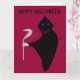 Esta aterradora tarjeta de Halloween muestra una imagen de la Parca Grim Reaper creada usando vectores. Él se pone amenazante sosteniendo su guadaña en su mano blanca y humilde. Sus ojos morados hundidos y su sonrisa demoníaca solamente son visibles debajo de su manto negro. Hay un saludo de personalizable en la parte delantera de la tarjeta. El interior de la tarjeta está en blanco.