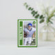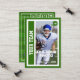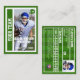 Sé igual que los profesionales al tener tu propio personalizado, un mariscal de campo, una tarjeta de intercambio. Esta tarjeta deportiva puede ser editada para mostrar fotos de ti mismo en la parte delantera y trasera, junto con tus estadísticas personales del quarterback de fútbol en la parte trasera. El anverso de la tarjeta tiene un diseño de zona de futbol en el lado izquierdo, donde se puede insertar un nombre de equipo en una carta deportiva. El fondo de la espalda del carné incluye un campo de fútbol de césped a rayas.