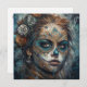 Celebre el "Día de los Muertos" con esta impresionante tarjeta de arte fino que presenta a una mujer con pintura facial de calavera intrincada en turquesa y oro. La obra de arte es una clase magistral en detalles, que combina motivos tradicionales de cráneos de azúcar mexicanos con texturas etéreas y ahumadas y adornos de rosas elegantes en su cabello. Con sus tonos azules profundos y sombríos y su expresión penetrante, este diseño es una forma poderosa y hermosa de honrar a los antepasados o enviar un saludo impactante para una celebración del Día de los Muertos.
