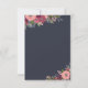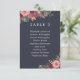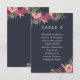 Tarjetas elegantes de plan de boda floral en azul oscuro con espacio para hasta diez invitados en texto blanco, con hermosos ramos de flores con rosas rosadas y hortensias burdeos.