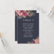 Tarjetas elegantes de plan de boda floral en azul oscuro con espacio para hasta diez invitados en texto blanco, con hermosos ramos de flores con rosas rosadas y hortensias borgoña.