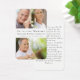 Este sencillo marcador de plegarias de simpatía por la foto puede ser entregado como un aguijón en una Celebración de la Vida o servicio funerario o enviado como un tributo especial a los que no pudieron asistir. La oración dice: Levantaré mis ojos a las colinas de donde viene mi ayuda. Mi ayuda viene de Jehovah, que hizo los cielos y la tierra. No perderá tu pie para ser movido; el que te mantenga no se detendrá ni dormirá. Jehovah es tu guarda. Jehovah es tu sombra sobre tu mano. El sol no te herirá de día, ni la luna de noche. Jehovah te preservará de todo mal. Él preservará tu alma. El Señor preservará tu salida y tu llegada de aquí en adelante, y aun para siempre. Salmo 121 Puede cambiarlo a una de sus opciones si es necesario usando el botón de personalización. Tenga en cuenta que la persona representada sólo se utiliza con fines ilustrativos, sustitúyanse las fotografías antes de realizar el pedido.