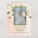 Este diseño de Poema Memorial Romántico presenta rosas blancas de acuarela y follaje verde sobre un fondo de color rosa melocotón claro con texto elegante en verde y negro. Agrega una foto en el marco de follaje. La parte posterior de la tarjeta del poema es de color rosa melocotón claro con flores blancas chic, y un marco de follaje con texto del poema.