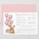 Esta tarjeta horizontal Baby Predictions & Advice incluye un suave y lúdico tema de osito de peluche, perfecto para una celebración de una ducha dulce. El lado izquierdo de la tarjeta muestra una adorable acuarela de un oso de peluche de color rosa, sentado al lado de un suave globo rosa y una pequeña caja de regalo, lo que añade un toque encantador y acogedor a la disposición. La paleta de colores utiliza tonos rosas y grises, con texto en una combinación de caligrafía manuscrita y tipos de letra serif clásicos para un aspecto bonito y clásico. El estilo general es minimalista y elegante, con un toque de atención a las dulces obras de arte y a las respuestas de los clientes. Se invita a los invitados a completar sus predicciones de bebé, como la fecha de llegada, la hora, el peso, el pelo y el color de los ojos, y a quién se parecerá el bebé. En la parte inferior hay espacio para compartir consejos para los futuros padres y firmar su nombre. La parte posterior presenta un fondo rosa de coordinación, pero puede cambiarse a cualquier color para que coincida con el tema de su fiesta. Totalmente personalizable, esta tarjeta añade un elemento caprichoso y reconfortante a su ducha de bebé. Es una combinación perfecta para el tema "Podemos esperar temprano" o cualquier celebración inspirada en un oso de peluche.