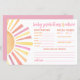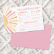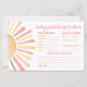 Esta tarjeta horizontal Baby Predictions & Advice presenta un diseño luminoso y alegre con temática solar. En el lado izquierdo, un gran sol con vibrantes rayos en tonos clásicos de amarillo, naranja y rojo le da un toque cálido y lúdico. A la derecha, la tarjeta invita a los huéspedes a completar sus mejores suposiciones para la llegada del bebé, incluyendo fecha, hora, peso, color de los ojos, color de pelo y a quién se parecerá el bebé. En la parte inferior hay un espacio para que los clientes compartan un poco de consejo para los futuros padres y firmen su nombre, lo que hace que sea un placer después de la ducha. La parte trasera tiene un fondo rosa suave, pero puedes cambiarlo a cualquier color para que coincida con el tema de la ducha de bebé. Personalizable completo, esta carta es una actividad divertida y reflexiva que le da un toque personal a su celebración.