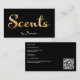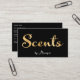 Una tarjeta de visita para las empresas que venden artículos perfumados. Esta tarjeta presenta un fondo negro con las palabras "Scents" en un texto falso de Relieve metalizado de oro.