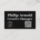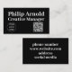 Una tarjeta de visita moderna y elegante con un fondo negro y un texto blanco y nítido, diseñada para exudar sofisticación y profesionalismo. El logotipo se sitúa de forma destacada en la parte superior y sirve como punto focal audaz para su marca. A continuación, la información de contacto está ordenada cuidadosamente, incluyendo la dirección del negocio, el número de teléfono, el sitio web y los usuarios de los medios sociales, asegurando que los clientes puedan conectarse fácilmente con usted. Un código QR se coloca estratégicamente en la esquina inferior, lo que proporciona una manera perfecta de acceder a su sitio web, portafolio o a una página de inicio de personalizados. La tipografía presenta una fuente sans-serif limpia y moderna, lo que garantiza una excelente legibilidad en el fondo oscuro. La disposición minimalista, con un amplio espacio negativo, crea una imagen pulida y profesional. Los acabados opcionales, como el brillo spot del logotipo, la laminación mate o las esquinas redondeadas, añaden un toque de refinamiento adicional.