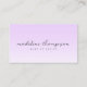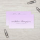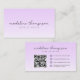La tarjeta de visita tiene un diseño suave y elegante con un fondo de gradiente morado claro. El nombre está escrito en un estilo de letra elegante, mientras que la profesión y los detalles de contacto utilizan un tipo de letra sans-serif limpio y moderno. El frente es minimalista, sólo muestra el nombre y la profesión. La parte posterior incluye un código QR y iconos de contacto ordenados cuidadosamente para facilitar el acceso. El diseño general es sofisticado y está bien organizado, por lo que es perfecto para un profesional de la belleza o la creatividad.