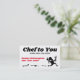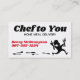 Chef de silueta blanca y negra con tenedores y cuchillos, tarjeta de visita para la entrega de comidas, servicio de restauración y chefs personales. El chef lleva un gorra y una chaqueta blancos deslucidos, con un fondo rojo y gris.