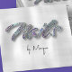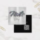 Esta tarjeta de moda tiene un fondo plateado falso con la palabra "uñas" en diamantes falsos en la parte delantera y tiene espacio para su nombre e información de contacto en la parte posterior. Este diseño incluye un código QR en la parte posterior.