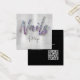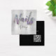 Esta tarjeta de visita de moda tiene un fondo azul falso con la palabra "uñas" en diamantes falsos en la parte delantera y tiene espacio para su nombre e información de contacto en la parte posterior. Este diseño incluye un código QR en la parte posterior.