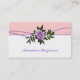 Tarjeta de visita floral blanca rosa rosa morado salvaje, con un hermoso rosa salvaje de color morado con hojas verde oscuro, líneas onduladas violetas y elementos de medio tono sobre fondo blanco y rosa claro. Diseño elegante y único, perfecto para uso personal o profesional.