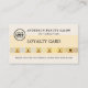 Tarjeta de presentación de fidelidad con su propio logotipo en un elegante diseño de fondo dorado amarillo. Se puede usar una fila de números de oro metálico para realizar las visitas de su cliente. En la parte posterior hay una plantilla de código QR opcional y fácil de personalizar. Una gran tarjeta de visita para un salón de belleza y otros negocios.
