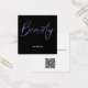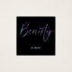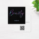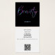 Una elegante tarjeta de visita con la palabra "Belleza" en la parte delantera en purpurina holográfico de neón con espacio en la parte posterior para su nombre e información de contacto. Este diseño incluye un código QR en la parte posterior.