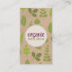 Un diseño de tarjetas de visita natural orgánica para el negocio de la salud o negocios orientados a la naturaleza o cuidado natural de la piel, comida o alimentación saludable. Tiene un fondo de papel kraft marrón, con un patrón de hojas verdes y acentos de púrpura de ciruela para un poco de diversión. También es ideal para tiendas de salud, terapeutas holísticos, clínicas de spa naturales, personas orientadas hacia industrias vegetarianas y veganas y similares, todo natural, orgánicas.