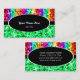Tarjeta de visita con un diseño moderno con estrellas diseminadas por estilizadas franjas de color arcoiris "secuin look" sobre un fondo verde, con texto escrito en blanco sobre una forma ovalada negra. Un diseño de personalizable para que puedas personalizar con tu propio texto, imágenes e ideas. Tenga en cuenta que se trata de una imagen de arte digital impresa y no contiene purpurinas o secuencias reales