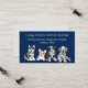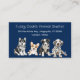Tarjetas de visita con diseño de perros, y tema animal, en color azul marino oscuro. El texto es gris claro, para el personalizar en dos lugares. Cuatro crías se sientan en la parte inferior de las tarjetas horizontales e incluyen las razas Husky / Malamute, Corgi, Border Collie y Dalmation. La parte posterior de las cartas es gris sólido.
