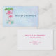 Tarjetas de visita con el ilustracion de una mamá y un flamingo de color rosa sobre una cama de flores suculentas florales con palmeras verdes que se balancean en la parte de atrás. Tropical y bonito. El fondo es azul claro.