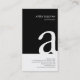 Un diseño de tarjetas de visita simple, elegante y profesional con la parte superior de color negro. La letra de su monograma aparece en una fuente grande que fluye hacia una parte inferior de la tarjeta en blanco roto. Su nombre y los datos de contacto aparecen en el lado derecho de la tarjeta. El diseño simple en blanco y negro crea una imagen muy contrastante que es potente y profesional. Ideal para temas gráficos, profesionales, de diseño, elegantes y serios. Personalizar inmediatamente con tu propio nombre y detalles.